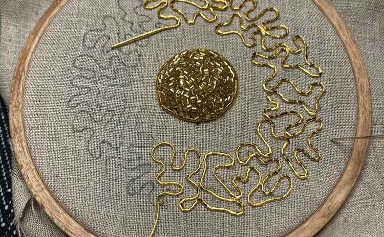 I Ramløse Husflid er vi lige nu optagede af guldbroderiet og i gang med at afprøve nogle helt enkle teknikker. Guldbroderi er broderi med metaltråd, perler og pailletter. Med det gyldne og metalliske broderigarn, et drys med perler og pailletter og et par enkelte kontursting, så har du allerede tilført dit broderi et ekstravagant og unikt udtryk.